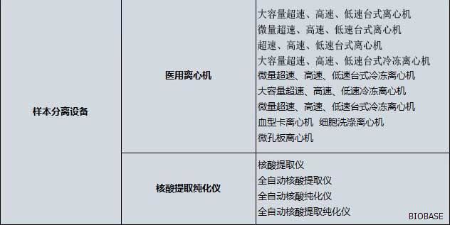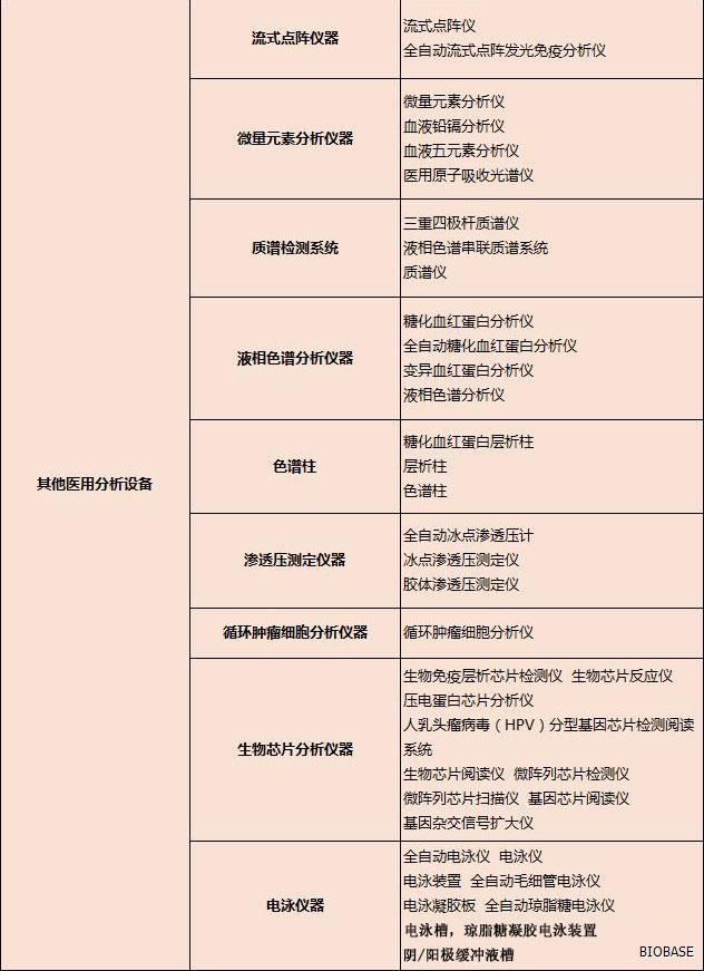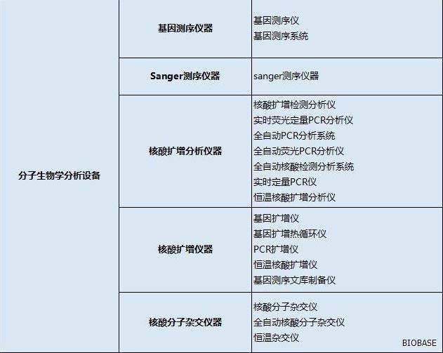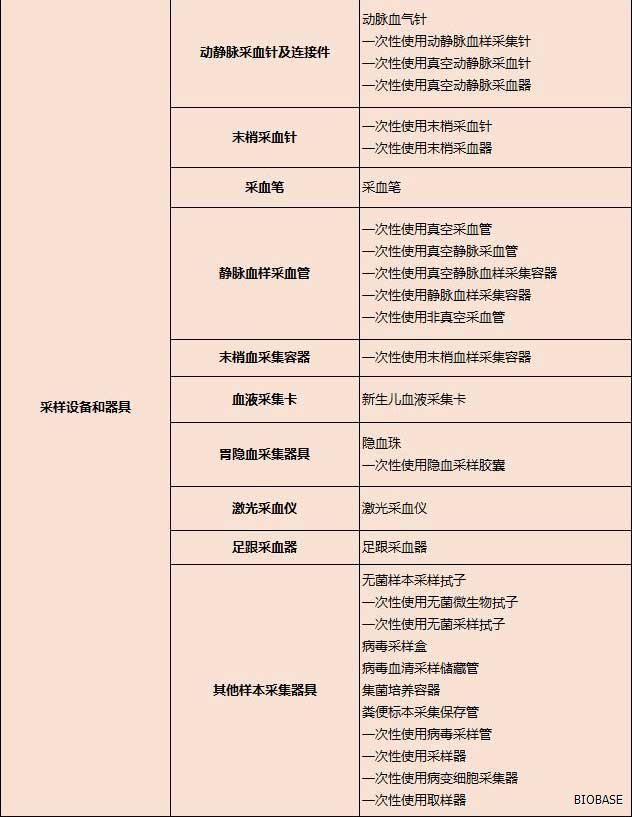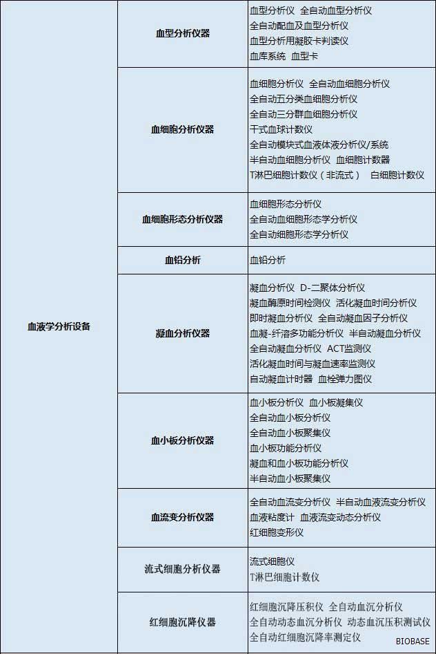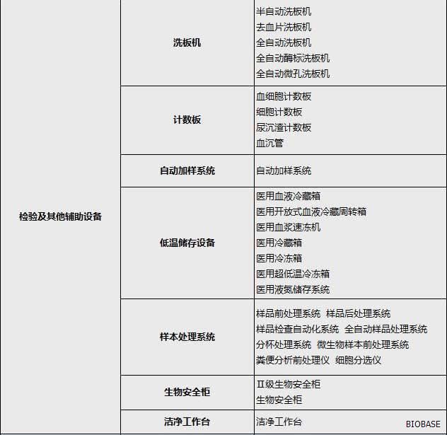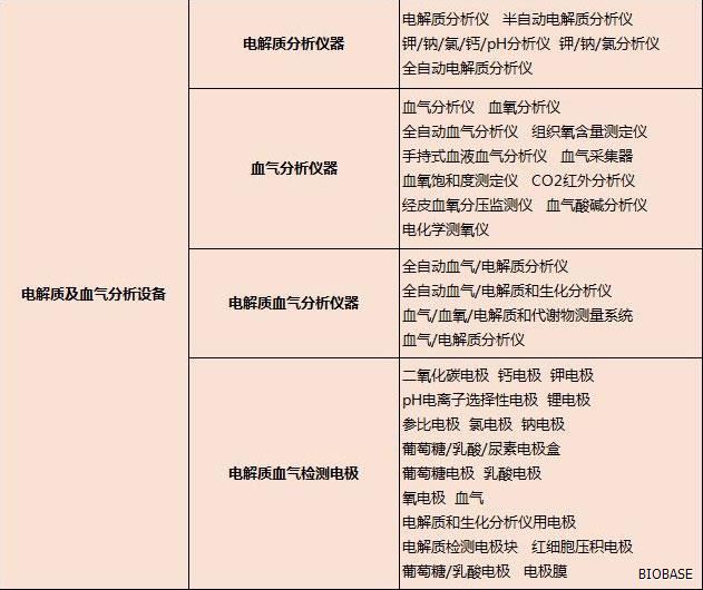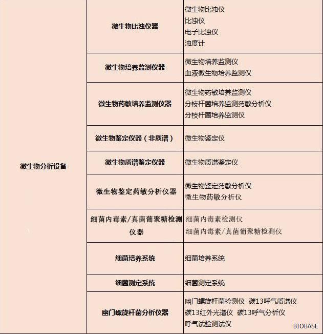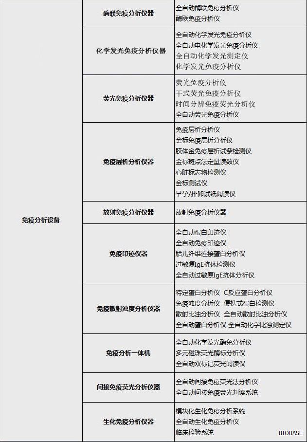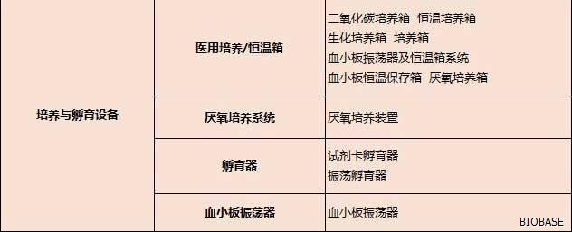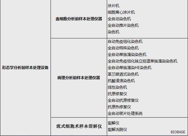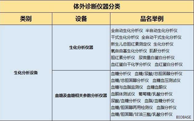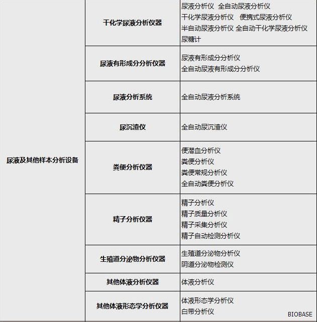 体外诊断仪器主要分为:生化分析设备、电解质及血气分析设备、免疫分析设备、分子生物学分析设备、微生物分析设备、尿液及其他样本分析设备、其他医用分析设备、血液学分析设备、采样设备和器具、形态学分析前样本处理设备、样本分离设备、培养和孵育设备、检验及其他辅助设备、体外诊断类软件等等。